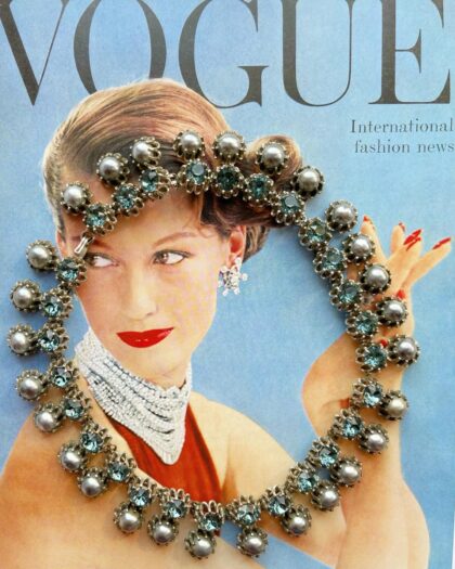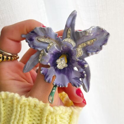 A beautiful example of costume jewelry created for Mademoiselle Chanel by the French Maison Gripoix. This brooch is a very collectible piece since in its rarity it has some particular features that make it even more desirable for a collector, in fact this in this case the poured glass is covered with nacre and pearled flowers like this one are almost impossible to be found in this conditions.
