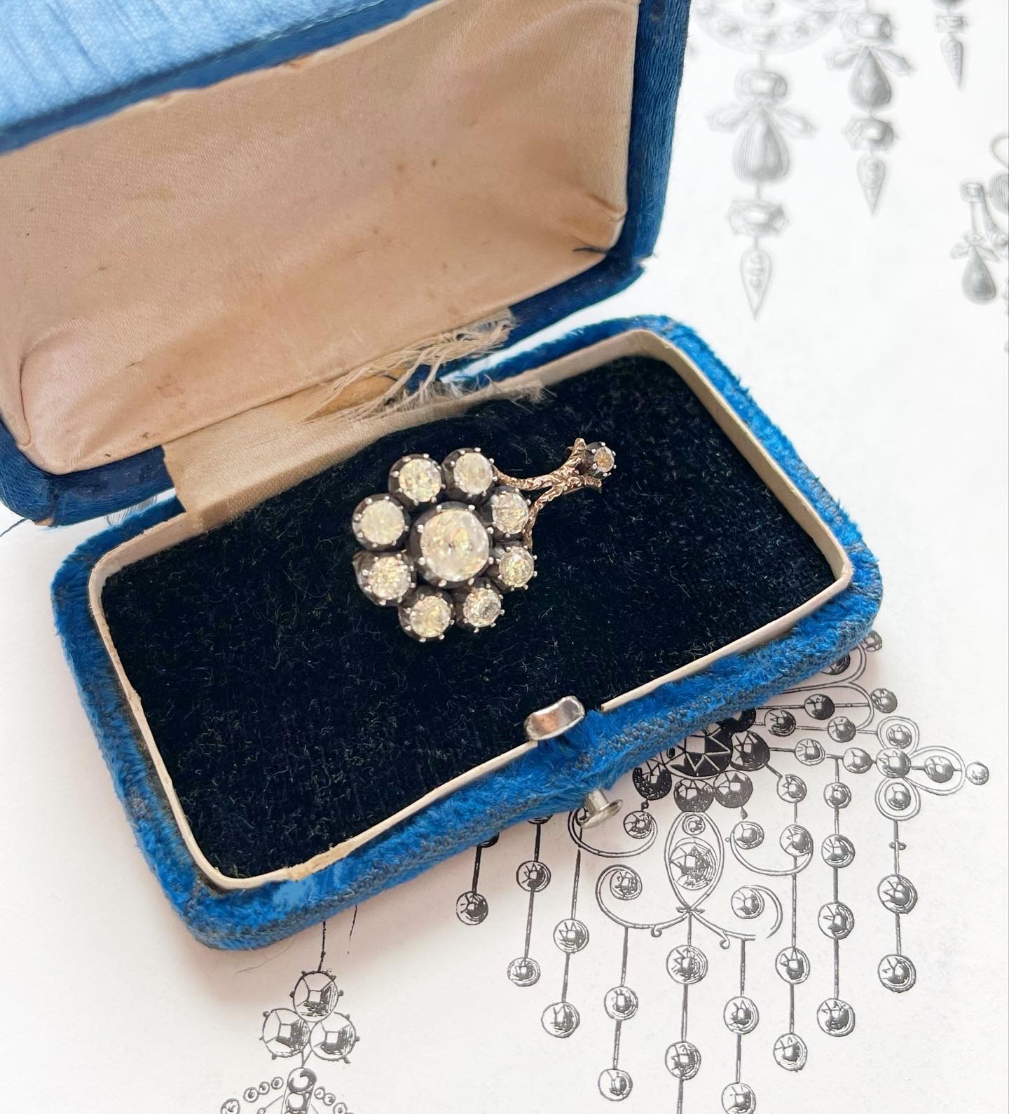 A lovely little brooch in 14k gold and silver representing the Halley’s Comet. This style was very popular from 1758 after its discovery and this pieces is date from 1800s to 1830s. The brooch is adorned with shiny pastes to simulate diamonds.