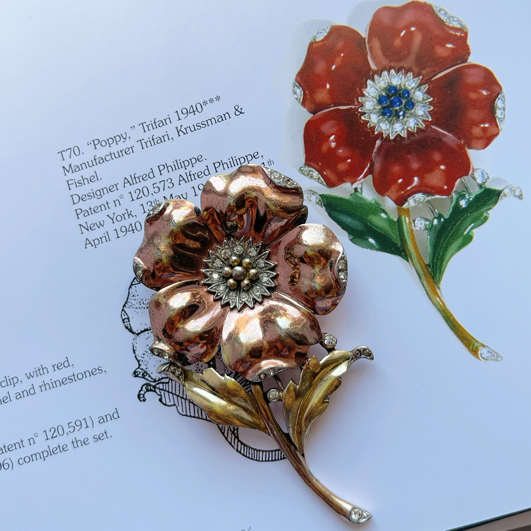 This brooch is a part of the “Rue De La Paix” collection from 1940 and it was designed by the talented Alfred Philippe. This brooch as a really particular rose golden finish that makes it a very rare piece. The center of the flower is decorated with a yellow golden finish and clear rhinestones.